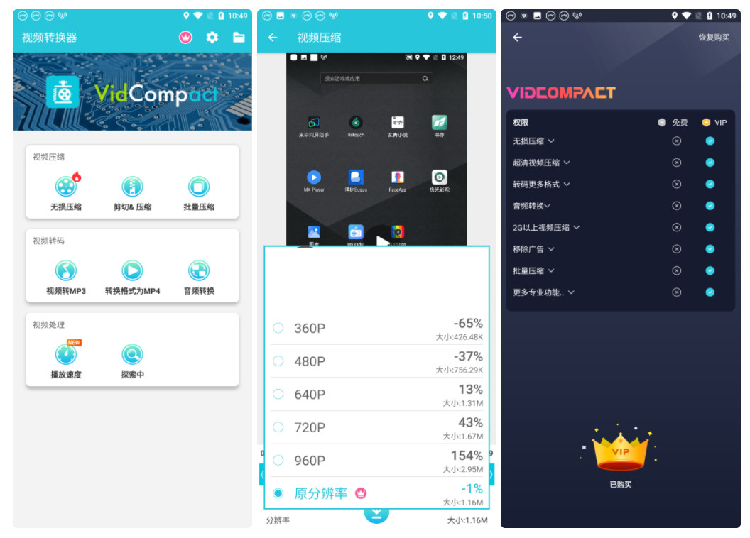vidcompact视频转换器是一个可以让用户在手机上进行视频格式转换的工具,内置的强大的转换引擎,就算是手机的性能也能做到超快速的视频转换。支持市面上多种主流格式之间的相互转换,并且操作起来非常简单,只要导入视频就可以一键完成操作。同时还可以对视频进行无损压缩,由于手机的储存空间有限,将其压缩后保存在手机中可以使用起来更加便捷。