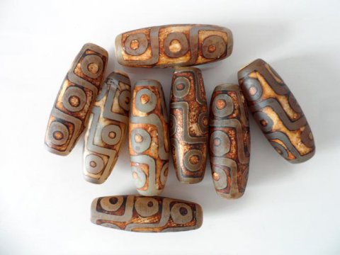 天珠的材质是含玉质及玛瑙的沉积岩,最初的天珠由海螺化石打磨而成,后来海螺化石数量减少,古人们就采用了一种含玉质及玛瑙成分的沉积岩打磨成天珠。