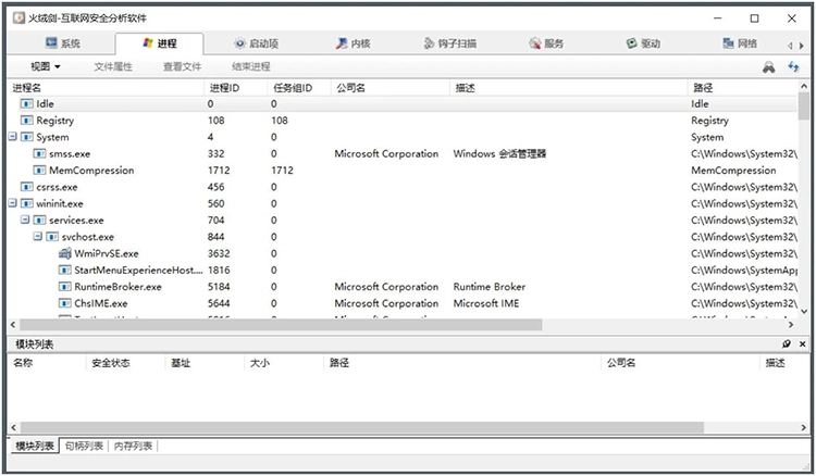 火绒剑是一款运行在Windows平台的安全分析工具,属于ARK工具。它提供了“程序行为监控”、“进程管理”、“启动项管理”、“内核程序管理”、“钩子扫描”、“服务管理”、“驱动扫描”、“网络监控”、“文件管理”、“注册表管理”十大功能。