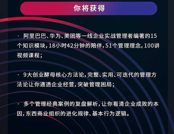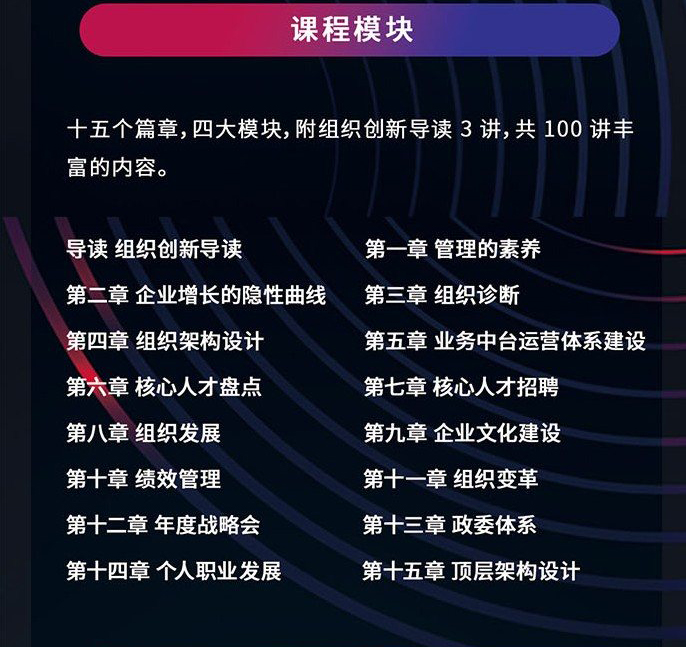 本课程立足于充满变化的社会环境下,从管理者的素养作为切入点,从组织创新的角度剖析企业可持续发展的内核与共性,并提供一整套完整的实践方法论。