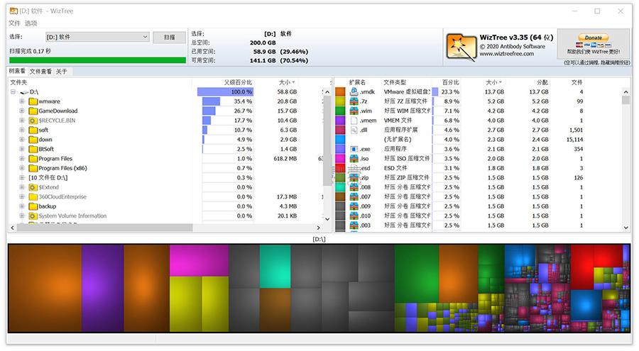 WizTree是一个非常高速的磁盘空间分析工具,适用于Windows。它会扫描你的硬盘,并显示哪些文件和文件夹使用了最多的硬盘空间。你的整个硬盘的文件系统显示出来,使它非常容易定位大文件和文件夹。使用WizTree提供的信息来快速定位和清除硬盘上的“空间大盗”。