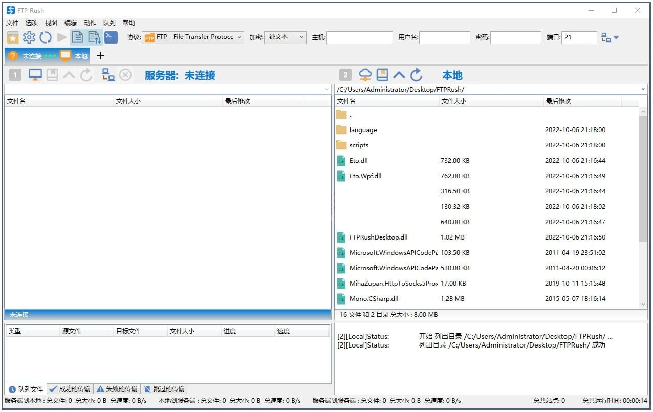 FTP Rush 是一个 Windows 平台下的高性能 FTP 客户端, 同时它也是一个优秀的 FXP 客户端, 不仅如此, 它还完美支持 SFTP 协议和 TFTP 协议。您可以使用 FTP Rush 来进行文件上传下载和服务器对服务器传输。FTP Rush 支持完全的界面自定义,可以定制出你喜欢的界面布局和风格, 通过内置的脚本功能还可以轻松地制作自动化任务。