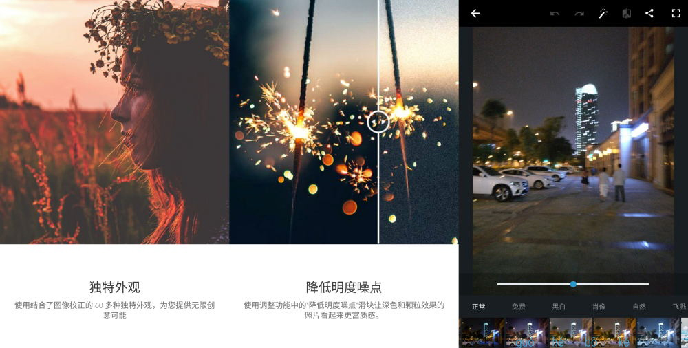 – 降噪:最大程度减少夜景照片和其它低光照片中恼人的颗粒与斑点。
