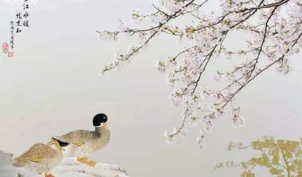 诗的第二句“春江水暖鸭先知”,视觉由远及近,即从江岸到江面。江上春水荡漾,好动的鸭子在江水中嬉戏游玩。“鸭先知”侧面说明春江水还略带寒意,因而别的动物都还没有敏感到春天的来临,这就与首句中的桃花“三两枝”相呼应,表明早春时节。