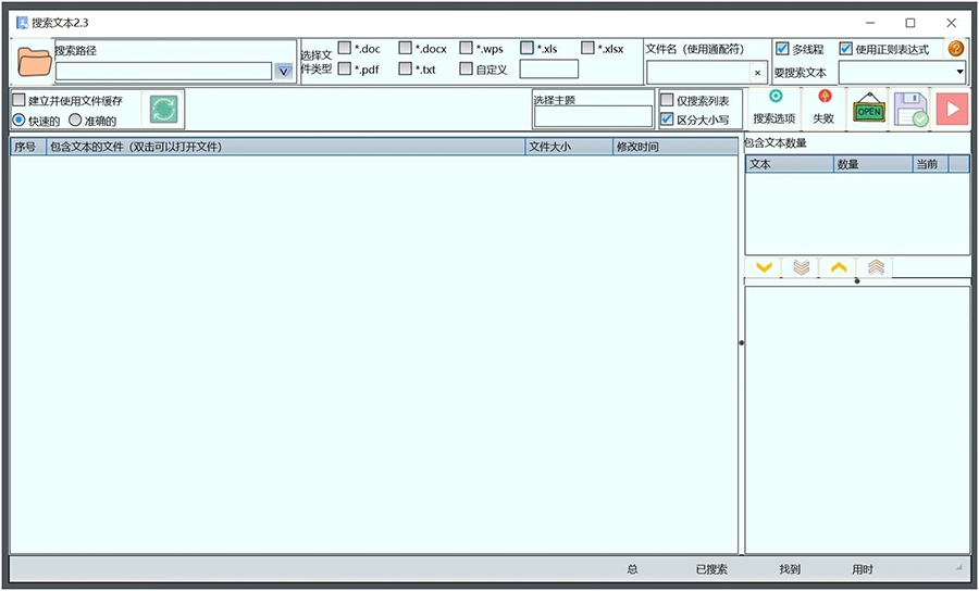 搜索文本 是一款从word、wps、excel、pdf和txt文件中查找文本的工具。因工作中要经常从大量word文档中查找固定的文本,所以作者做了这个工具。可以批量从doc、docx、wps、xls、xlsx、pdf(需要开源pdfium.dll支持,已放在包里)和txt文件中查找关键文本,文本文件可自定义多个扩展名(如:.html,.ini,.pas)。