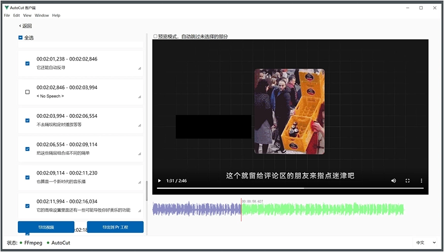 AutoCut 是对你的选择视频自动生成字幕的一款工具。然后你需要保留的句子,AutoCut 假设你视频中对应的片段切并保存。你无需使用视频编辑软件,只需要编辑文本文件即可完成剪切。