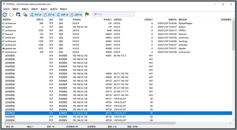启动 TCPView 时,它将枚举所有活动的 TCP 和 UDP 端点,将所有 IP 地址解析为其域名版本。可使用工具栏按钮或菜单项切换已解析名称的显示。TCPView 显示拥有每个端点的进程的名称,包括 (服务名称(如果有,任何) )。