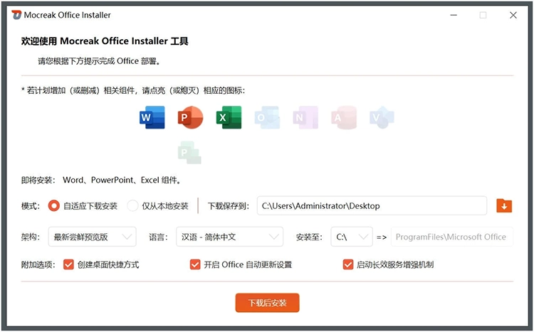 Mocreak 一键自动化、无人值守下载、安装、部署并激活Office 的利器,支持 Win11、Win10 等操作系统,自适应匹配 x86、x64 架构。可以一键安装,也可以卸载旧版本的office,如果有旧版本,如果不卸载直接安装也是可以的,安装中会提示兼容问题,并选择卸载旧版本。