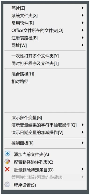 如影随形,可随时随地唤出:通过使用全局快捷键,您可以随时随地唤出路径跳转列表,(加速键或鼠标)点击后立即应用到当前打开的程序中,路径跳转列表也随之隐藏,等待下一次使用,真正做到了召之即来挥之即去,各种路径之间您可任意驰骋。