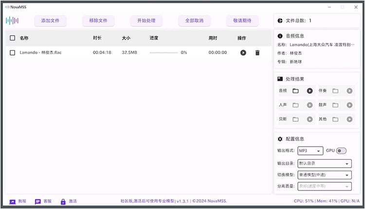 NovaMSS 基于最新 AI 模型优化的音乐源分离工具。它能够轻松地批量提取伴奏、人声、贝斯、鼓点等音轨,并且支持 GPU 加速,以提高处理速度和效率。社区版完全免费,简单易用,上传文件,点击处理,查看结果。可以直接打开分离后的音频文件位置,或使用内置的音频播放器播放分离后的音频文件。