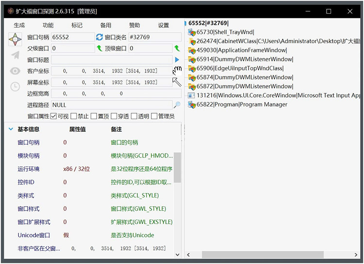 扩大福的窗口探测 是一款网友自制分享的窗口探测工具,扩大福的窗口探测软件可以帮助用户们去调整窗口的样式,控件样式等,让用户们可以根据自己的需求去调整每个软件的窗口。