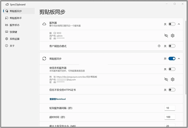 SyncClipboard 是一款剪贴板同步工具,支持文字、图片和文件。服务器/客户端架构,可以使用客户端内置服务器、独立部署服务器,也可以使用支持WebDAV的网盘作为服务器。