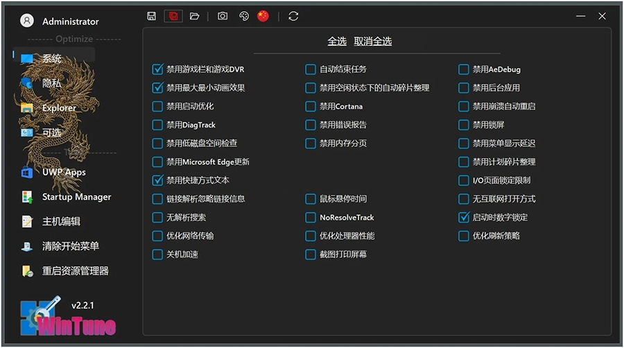 WinTune 是一款免费无广告、绿色免安装的系统优化软件。软件功能包含系统优化,隐私优化,hosts编辑,uwp应用管理等等,支持win10以上,并且支持简体中文。软件还支持配置文件导出导入。使用前可以导出配置文件,必要时可以导入恢复。