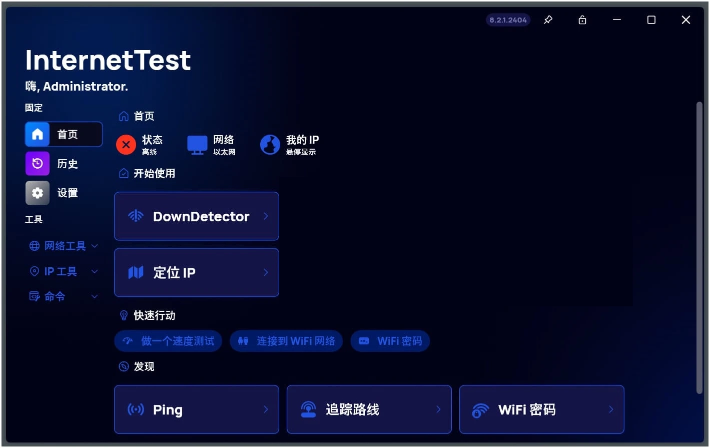 InternetTest Pro 是一款专为 Windows 用户设计的功能强大且现代化的连接实用程序。它旨在帮助用户监控和优化他们的互联网连接体验,以确保他们能够充分利用网络资源。软件的主要功能包含:检查互联网连接、执行速度测试、网站可用性检查、DNS信息检索、附近的 WiFi 网络信息、IP地址显示、路由追踪功能、WiFi密码恢复等等。