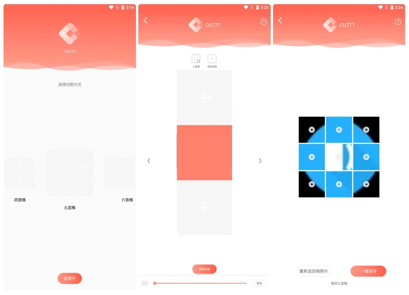 CUTTT 是一款手机图片九宫格制作工具,软件功能有九切图,可以将一张照片切成3×3,2×2, 1×1, 1×3, 2×3的网格图,并添加上特效、装饰边框或者裁剪成苹果、桃心、动物、花朵等形状;拼九图,你可以将9张图片自由拼合成一张新的九宫图。CUTTT 可以把1张大图切成9小份,并且每一张小图背后还会藏着更精彩的照片,2×2的4张图,3×3的9张图,任你选择,每张小图背后的图片数量也任你选。