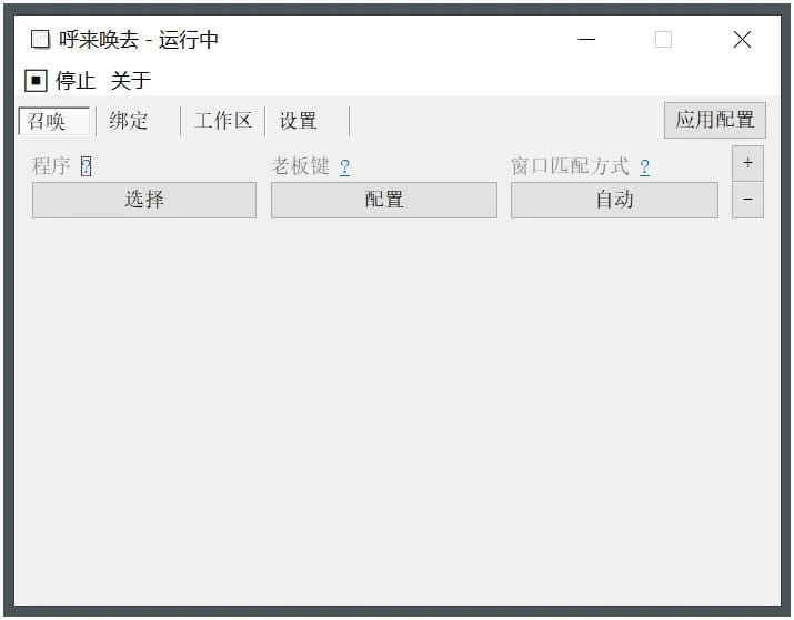 呼来唤去 是一款功能强大的自定义老板键工具,它可以为任意程序设置老板键,实现随叫随到的功能。通过为当前窗口绑定老板键,你可以将窗口的显示状态保存为工作区,并使用一键切换功能,方便快捷地在不同的工作区之间切换。软件还提供了多种窗口匹配模式,包括自动/进程、类名和标题等。