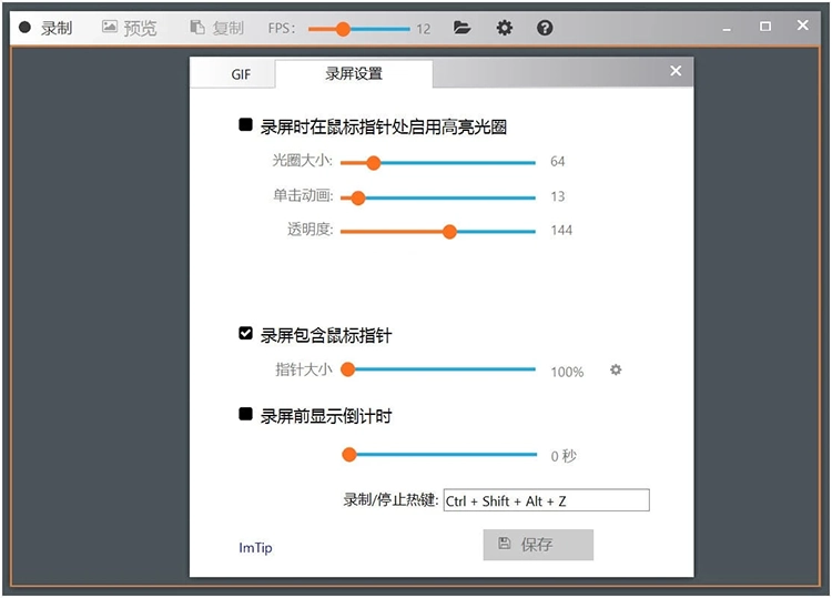 可在 GIF 有限的颜色限制下显著提升画质。在高分屏下可自动压缩 GIF 至正常分辨率,其他录屏工具通常不压缩,不压缩的 GIF 在高分屏上会被重复放大,在标准分辨率下也会超出正常大小。Gif123 可录制合成鼠标轨迹,可调整鼠标指针大小,可在设置中打开鼠标指针高亮光圈功能,高亮光圈可跟随鼠标移动以指示鼠标位置,单击鼠标时会显示动画光圈( 光圈颜色透明度为0 时仅显示单击动画 )。
