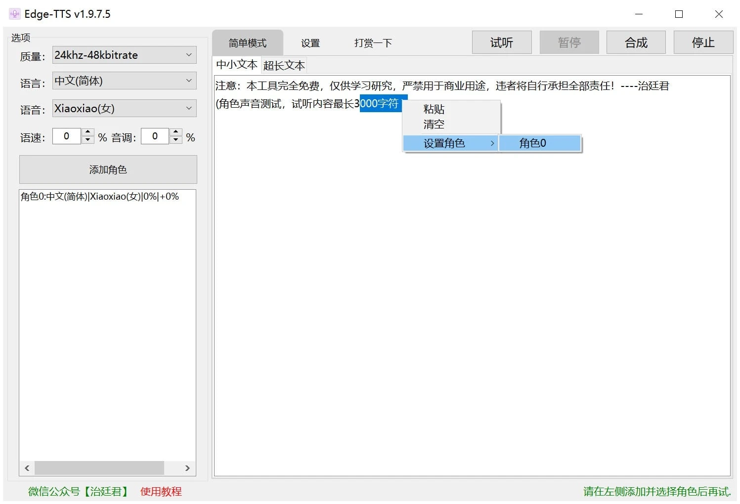 一款来自B站UP主@治廷君制作的一款小工具,可以调用Edge的接口来给文字配音,特点是完全免费限制次数,支持3000字以上的超长文本。