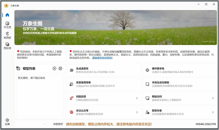 万象生图 是一个windows文生图的软件,本软件支持一键安装即可在普通电脑上快速运行文生图模型,无需复杂配置和GPU硬件。本软件使用简单,支持各种快速生图模型。软件支持Windows7及以上64位操作系统。至少需要4G空闲内存才能良好运行,最好机器内存在16G以上。如果机器内存小于8G,生图速度会较慢。软件生图使用的是CPU,无需GPU即可运行。