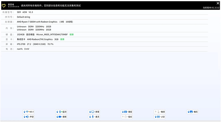 爱回收笔记本质检系统 是一款专为笔记本电脑硬件检测而设计的软件,以其快速的检测速度、简便的操作流程和直观的检测结果,为用户提供了一种高效、易懂的硬件检测解决方案。该系统不仅适用于对电脑硬件有一定了解的用户,也特别适合对硬件知识不太熟悉的小白用户,帮助他们轻松了解笔记本电脑的硬件状况。