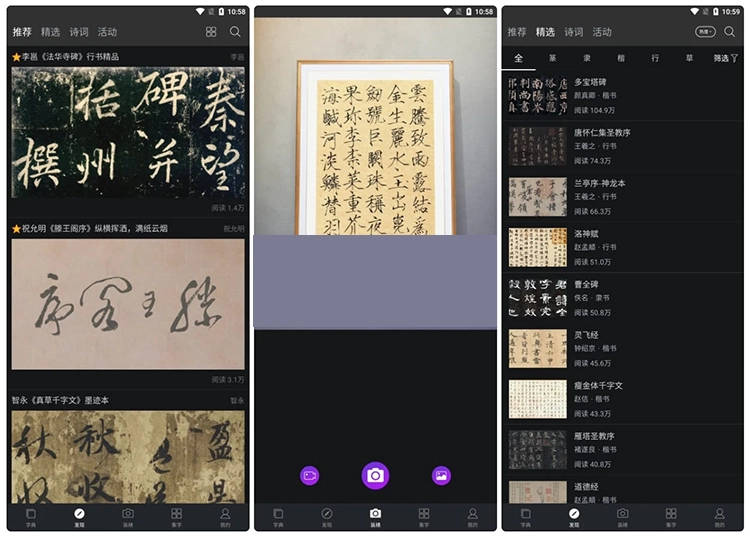 书法字典大全app 是专为书法爱好者们而设计的一款学习软件。软件为用户们提供了非常丰富的作品供大家家欣赏,其中从字体的类型上来看,就包含了篆书、隶书、楷书、行书、草书等在内的多种类型。