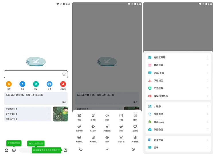 嗅觉浏览器 是一款功能丰富的手机浏览器。它提供了多窗口、自定义插件、自定义UA、广告拦截、资源嗅探等实用功能。