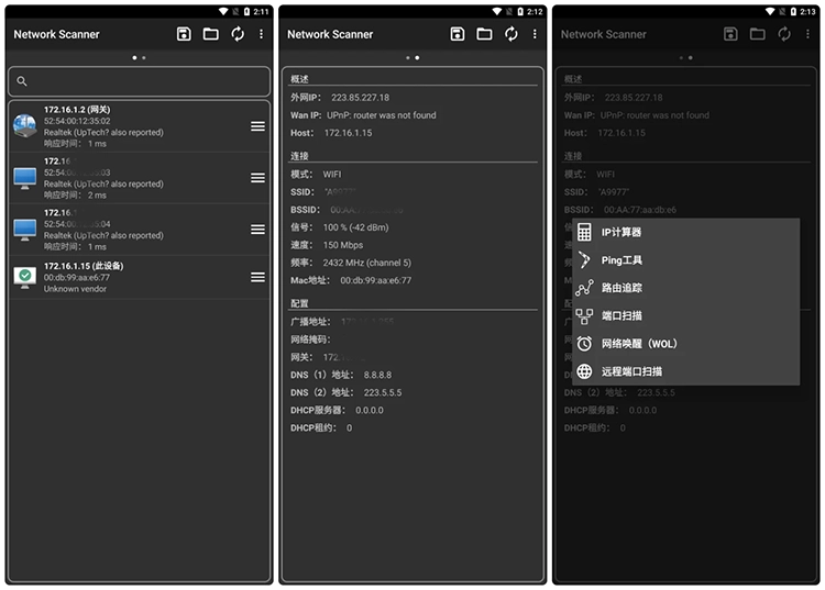 Network Scanner 是一款不错的安卓端网络工具。扫描网络内所有主机,可以了解WiFi使用者与每台设备的更多信息。同时支持-arp读取,icmp ping,udp ping,dns请求的扫描模式与筛选。软件还有许多实用工具内置:Ping工具、IP信息查询、路由追踪、端口扫描、WOL网络唤醒、远程端口扫描等等。