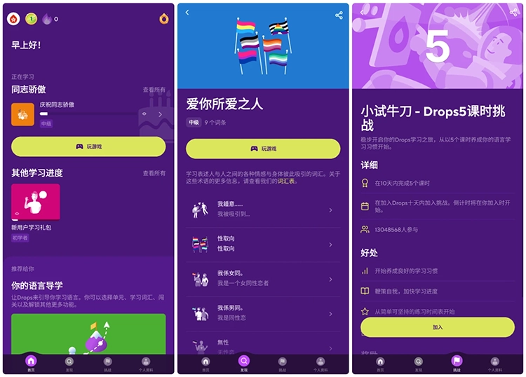 Drops 是一款可以使用本软件进行各种语言学习的软件,平台通过多种方式让用户对各种语言进行有趣的学习,能够帮助用户获取更加高效的学习效率,用户直接根据自己想要学习的语言进行选择学习,即可使用方式十分简单,同时提供多种学习方式,能够在趣味中进行学习,加深对学习的影响,提高学习的效率。