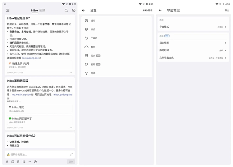 inBox笔记 一款深度融合Android本地化特性的卡片笔记软件,灵感源自创新的flomo应用。它旨在为用户提供无缝、高效的笔记记录体验,让每一个灵感闪现都能即时捕捉,形成连绵不断的知识川流。inBox笔记以简洁直观的操作界面,搭配流畅的输入体验,助您轻松管理日常思绪,构建个人知识体系。