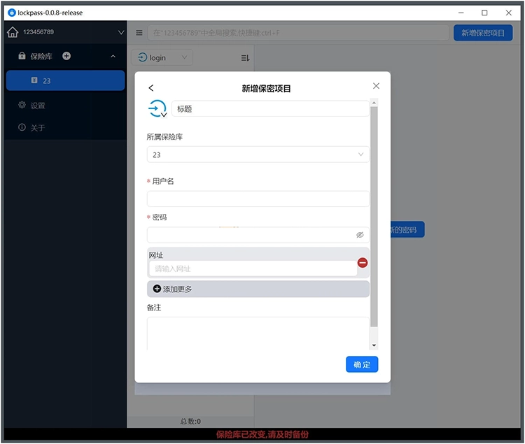 Lockpass 是一款密码管理工具,是作者参考1password做的,目前功能尚不完善,作者会在使用过程中不断优化。软件采用双密码机制,主密码和25字符的key(软件生成)组合成超强密码。软件有随机密码生成工具。保险库功能可以将不同的密码信息分类保存,支持切换不同的账号。