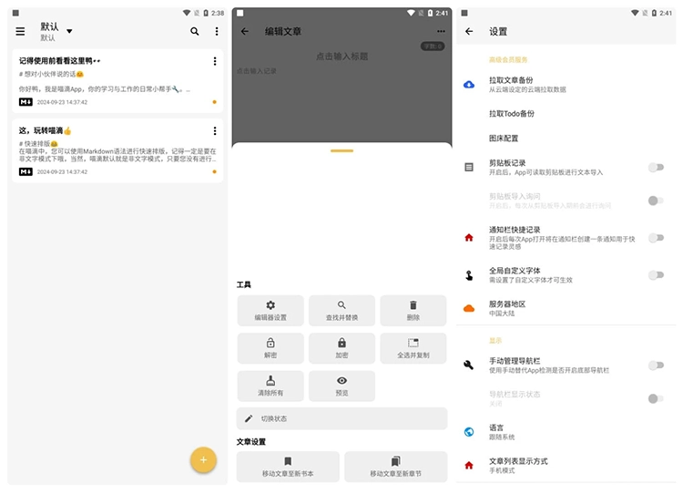 喵滴 是一个跨平台、体验优秀的 Markdown 编辑器。喵滴在安卓平台上,还做出了特别的优化。如别具一格的多编辑模式: 写作模式、专注模式,以及 Markdown 的及时渲染模式(也称所见即所得模式)。针对移动端操作不太方便的特点,喵滴还为您配备了可自定义的 Markdown 快捷栏以及文本格式化,极大地提升了操作便捷性。