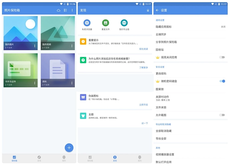 GalleryVault照片保险箱 是一款功能强大的手机照片管理软件,专注手机照片隐私管理,拥有强大密码保护功能,能够有效的针对用户的文件,进行一个全面的保护,并且还能够多选择隐藏或还原您的媒体文件等。除此之外,这款软件界面简洁,操作方便,支持和闯入警报功能,更有着影像浏览设计,让你可以随时随地愉悦地欣赏你的私密照片与视频。同时照片保险箱手机版采用独特加密算法,完美支持存储在SD卡文件的加密,支持图像、 视频、 音频和文档文件。