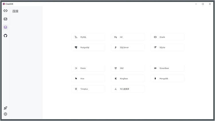 Chat2DB 是一个集成了人工智能的数据库SQL客户端和报表工具,支持 windows、mac 本地安装,也支持服务器端部署,web 网页访问。支持MySQL、Oracle、PostgreSQL、DB2、SQLServer、DB2、SQLite、H2、ClickHouse等。 Chat2DB 集成了 AIGC 的能力,能够将自然语言转换为 SQL,也可以将 SQL 转换为自然语言,可以给出研发人员 SQL 的优化建议。
