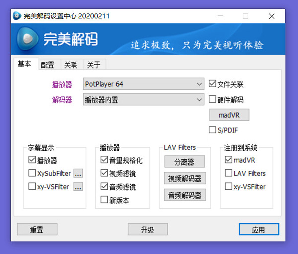 完美解码是一款为高清影视爱好者精心打造的影音解码包,能软硬件解码播放流行的视频和音频格式。集成多媒体播放器PotPlayer、MPC-HC、MPC-BE,分离器解码器套件LAV Filters,高画质渲染器madVR,支持中英语言安装使用。