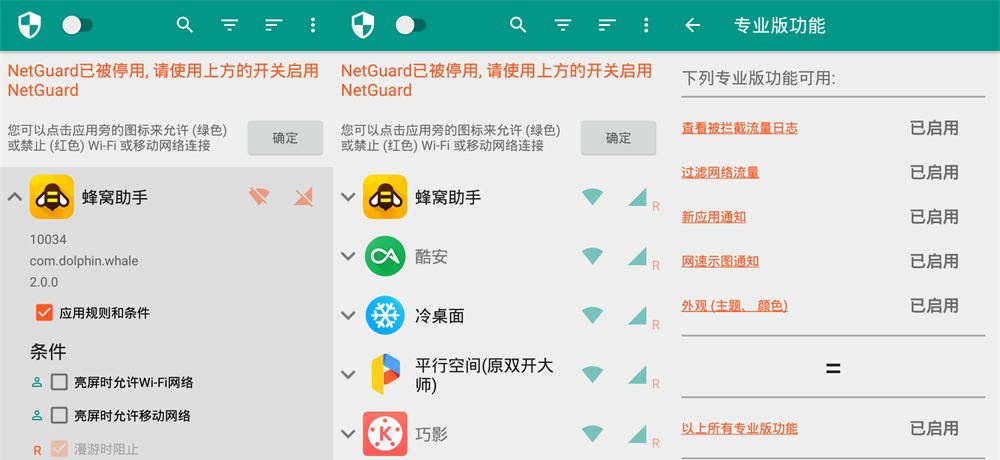 NetGuard使用网络中间人的技术,限制应用联网权限,可以给每个应用制定联网规则,是一款网络管理必备软件。其最大的优点就是无需root权限即可自定义你的网络。阻止应用访问网络有利于节省您的数据流量,节电以及保护您的隐私