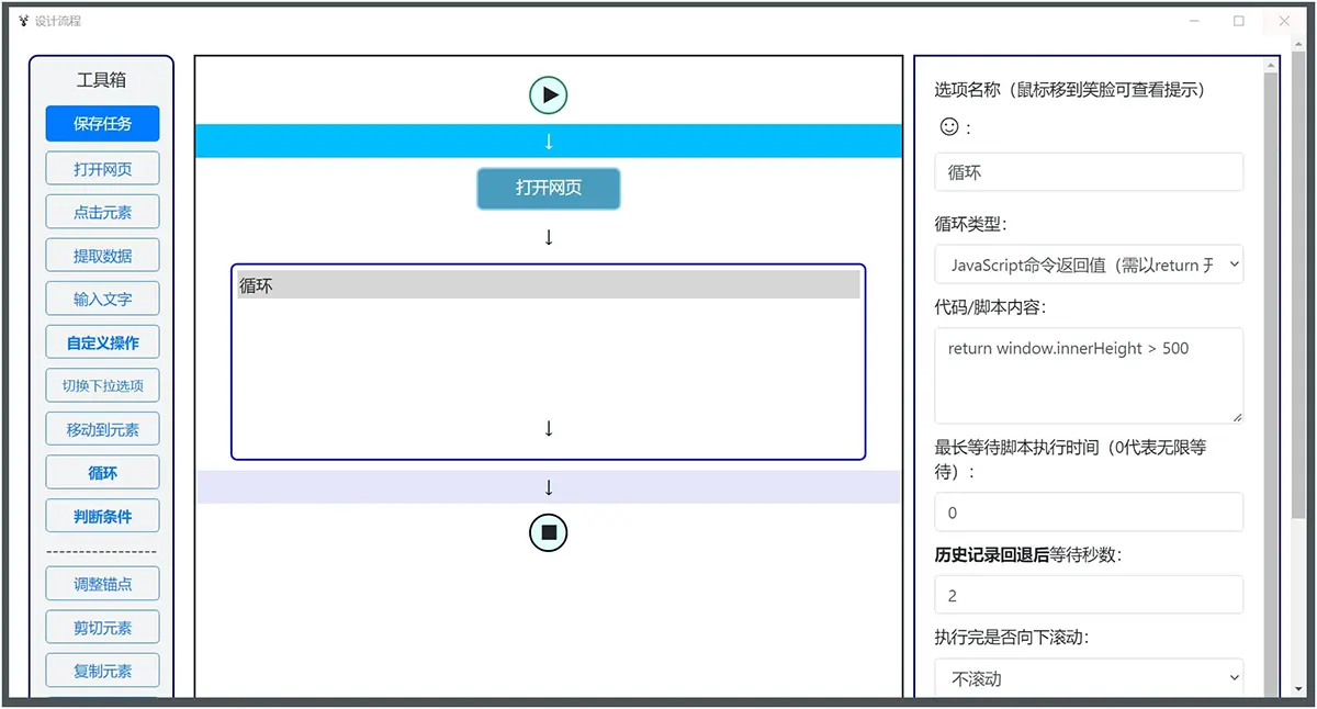 支持配置云服务器,可以配置好云服务器地址用来统一保存任务信息,统一管理。还可以定义任意复杂的任务,支持无限循环嵌套和判断条件,还可以执行自定义JavaScript指令和系统指令。