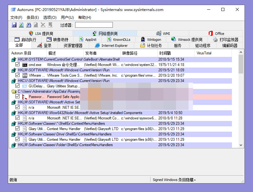 Autoruns 的“隐藏已签名的 Microsoft 条目”选项可帮助您放大已添加到系统中的第三方自动启动映像,并且它支持查看为系统上配置的其他帐户配置的自动启动映像。下载包中还包含一个命令行等效项,可以 CSV 格式输出,Autorunsc。