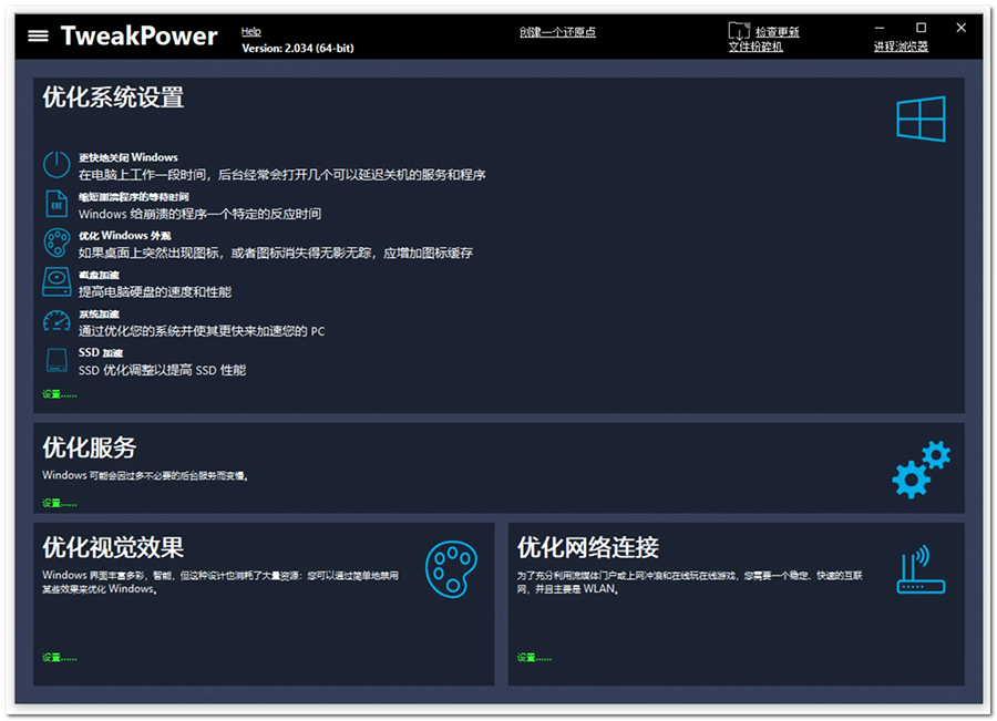 TweakPower最新版是一款来自国外的专业化电脑性能优化工具,TweakPower最新版功能强劲,支持通过修改系统设置(注册表)从而达到提高系统运行速度的目的,让你的电脑运行速度轻松变快。