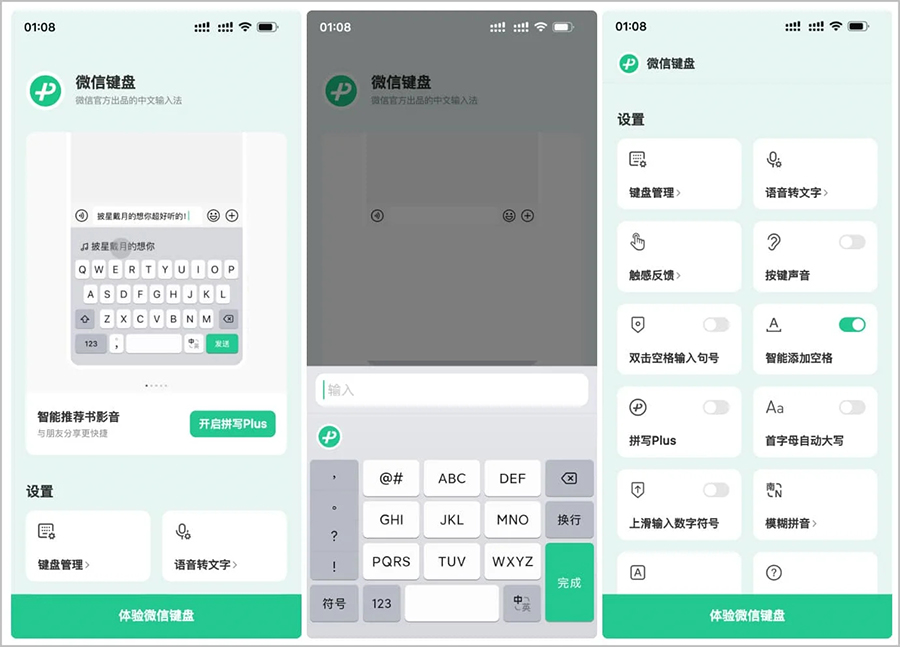支持九宫输入、全键盘输入、五笔输入、双拼输入、语音输入